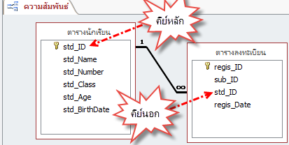 เป็นคีย์ที่เชื่อมตารางที่เกี่ยวข้องกันเข้าด้วยกัน เช่น รหัสนักเรียนของตารางนักเรียน และรหัสนักเรียนของตารางลงทะเบียน ที่มีฟิลด์รหัสนักเรียนเป็นฟิลด์ร่วม โดยที่รหัสนักเรียนเป็นคีย์หลักในตารางนักเรียน ส่วนรหัสนักเรียนของตารางลงทะเบียนเป็นคีย์นอก